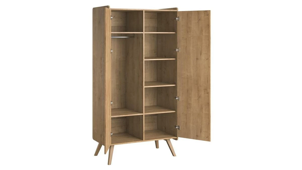 Si l’armoire MOA séduit par sa silhouette rétro, elle a aussi la particularité d’offrir un très bel espace de rangement. En partie gauche de l’armoire se trouve deux étagères et une penderie (L47.5 x H105 cm) pour tout ce qui doit rester sur cintre. En partie droite se trouve cinq étagères (L47.5 x P55 x H33.5 cm) pour les vêtements ou le linge de maison.