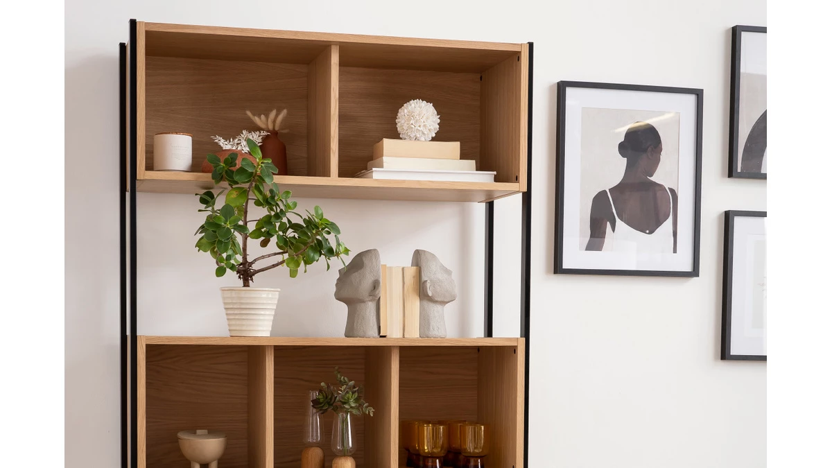 Idéale dans un salon ou dans un grand bureau, cette bibliothèque haute aux dimensions L98 x P35 x H195 cm habillera votre intérieur et lui donnera une vraie personnalité. Son placage chêne et ses détails métalliques noirs en font une belle pièce de caractère qui rappelle subtilement le style industriel. Un meuble de rangement totalement dans l’air du temps qui saura ravir les mordus de déco !