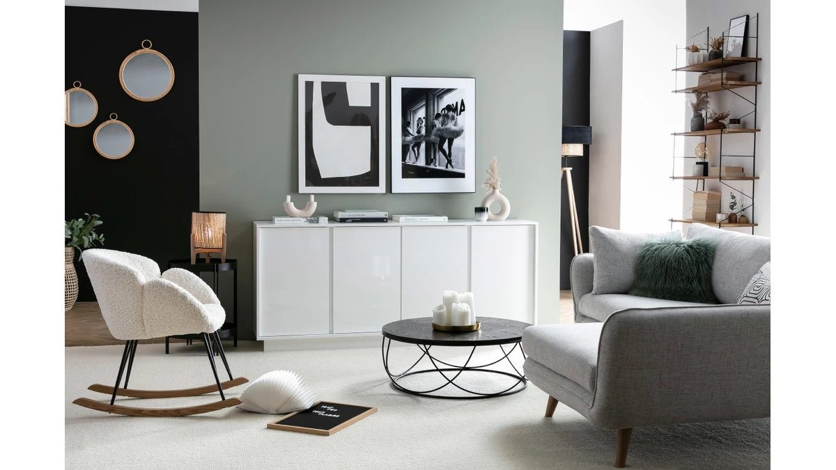 Composé de panneaux de particules de bois aggloméré blanc laqué, ce buffet design trouvera parfaitement sa place dans un grand séjour-salle à manger de style contemporain comme dans une chambre. Ce buffet blanc brillant apportera sans nul doute une belle luminosité dans votre pièce de vie.