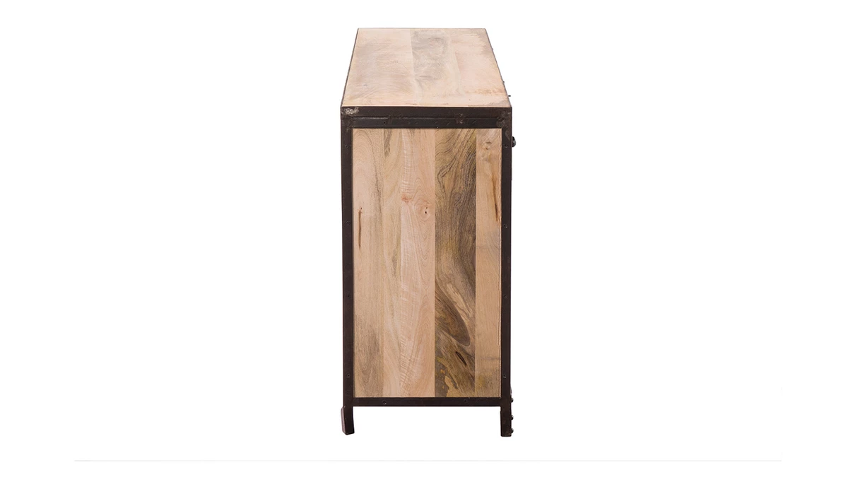 Ce meuble de rangement est en acier brut et manguier massif, finition vernis naturel incolore.