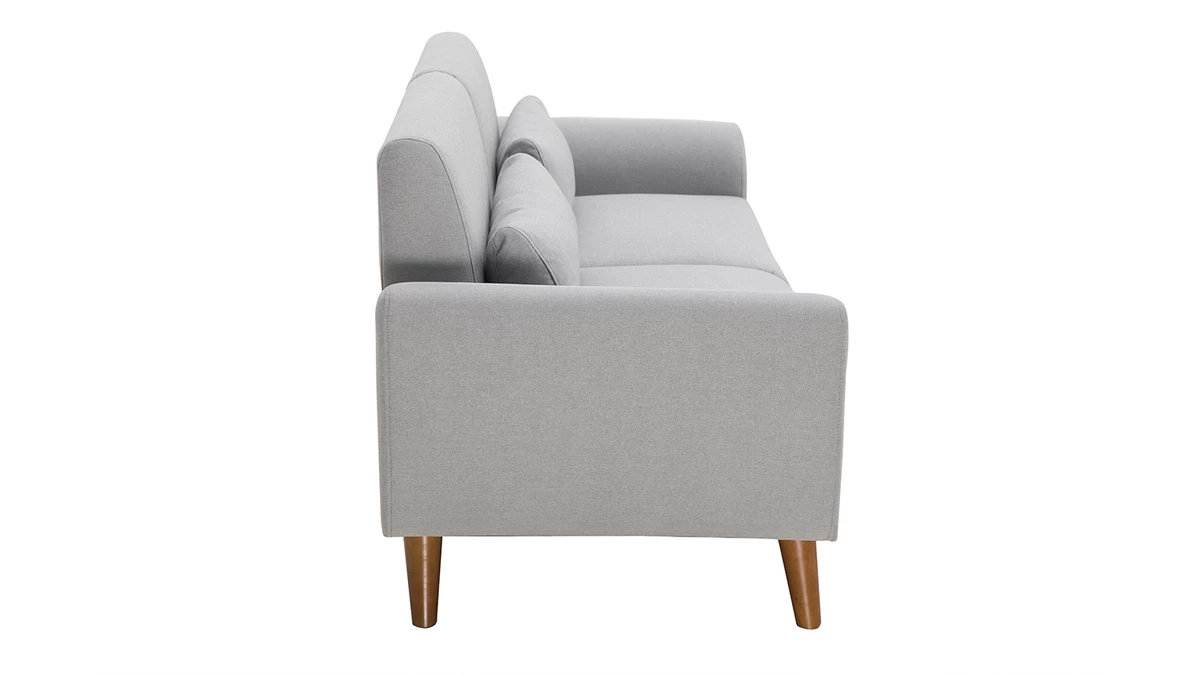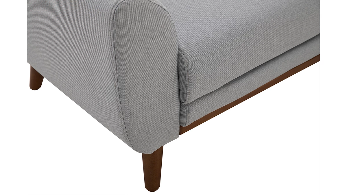 Canapé tendance au style inimitable, on souligne l’élégante alliance du revêtement tissu gris, des lignes arrondies et d’un piètement en hévéa massif teinté noyer.