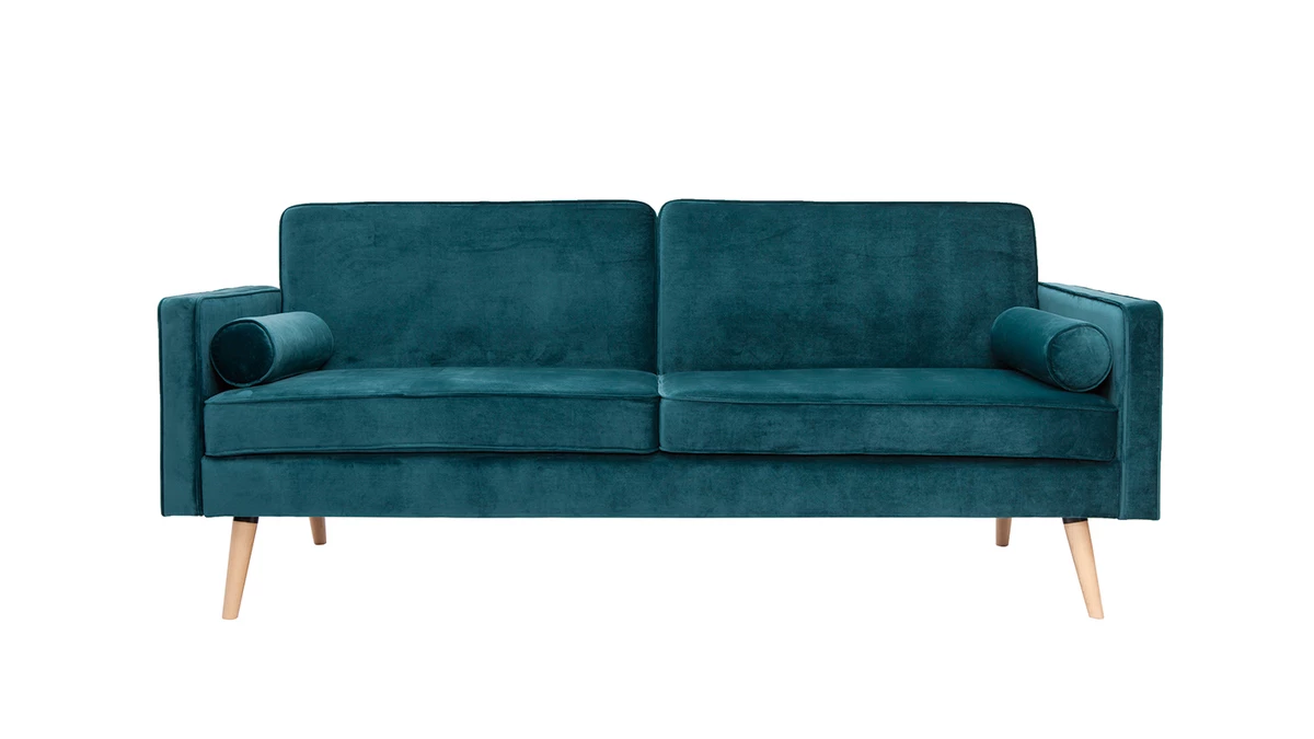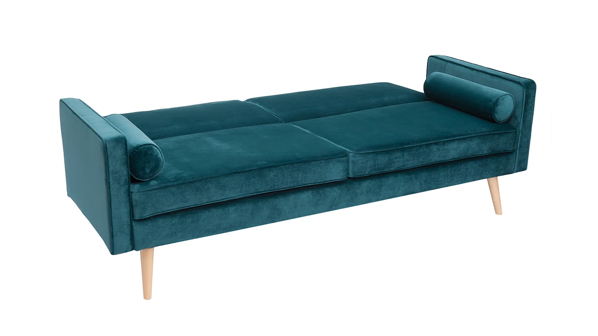 Sous son design épuré, son élégant revêtement en velours bleu pétrole et ses pieds légèrement fuselés en bois clair, se cache un canapé 3 places le jour et un confortable lit d’appoint la nuit.