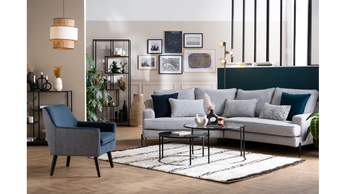 Le chic à la française a toute sa place dans le salon. Avec ce canapé 5 places, un tapis XXL et une belle table basse design, on joue la carte de l’élégance.