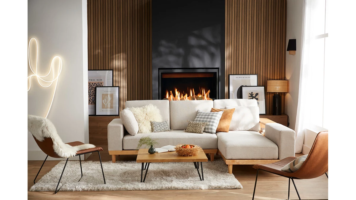 En plus de mettre en valeur votre nouveau canapé, un tapis écru et une suspension en lin contribueront grandement à la création d’un univers doux et réconfortant.