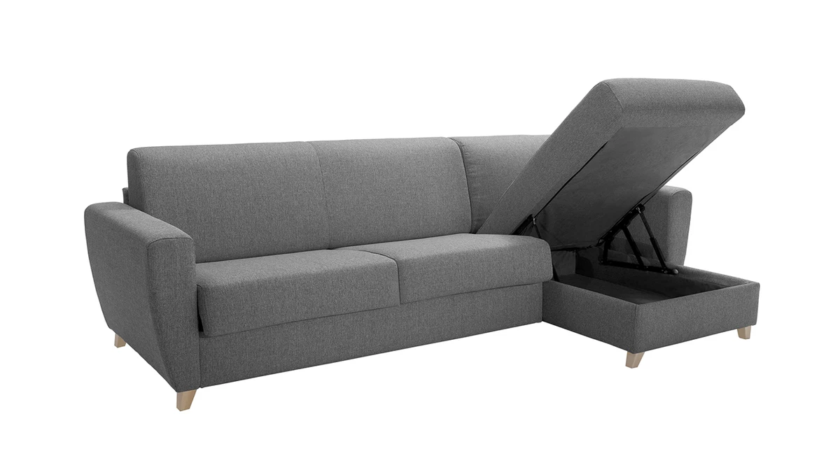 Avec sa belle ampleur d’assise, le canapé d’angle GRAHAM est l’allié des salons conviviaux et des grandes maisonnées. Grâce à son angle réversible, il s’adapte à toutes les configurations d’intérieur. Son assise cache également un véritable lit deux places pour faire dormir ses invités. Il suffit de tirer sur le dossier pour déplier instantanément un couchage 140 x 190 cm. La méridienne renferme un grand coffre de rangement pour organiser le linge de lit. Fonctionnel et pratique, ce canapé d’angle convertible est idéal pour offrir rapidement un couchage supplémentaire confortable. Fabriqué en Italie, c’est un canapé lit de qualité.