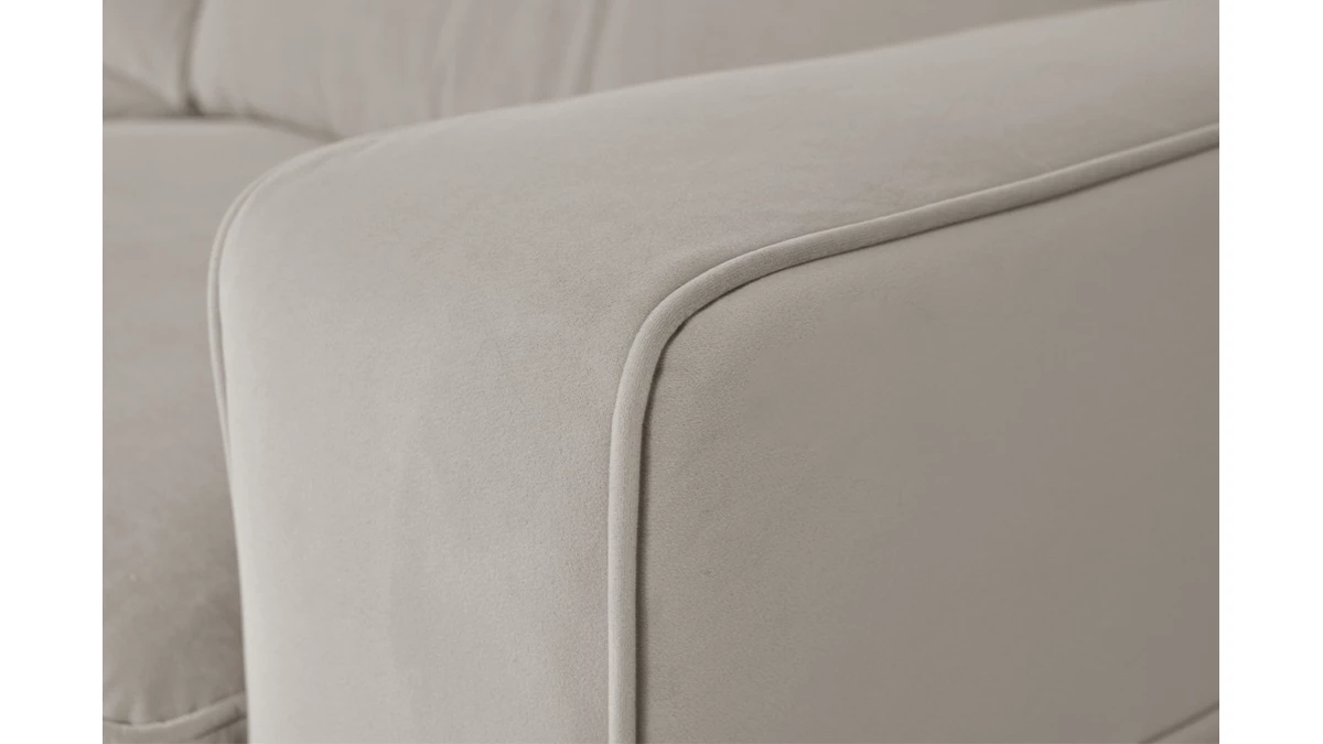 Le canapé GOTTA conjugue harmonieusement élégance et bien-être. Pour un maximum de confort, les coussins d’assise possèdent un rembourrage mixte : mousse polyuréthane HR (densité 30kg/m3) et ouate (densité 300 g/m2). L’élégant revêtement en velours mat grège (100% polyester) nous enveloppe de sa douceur. Le canapé GOTTA c’est la juste dose de chaleur et de confort dont le salon a besoin !