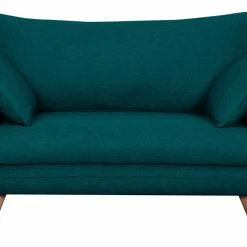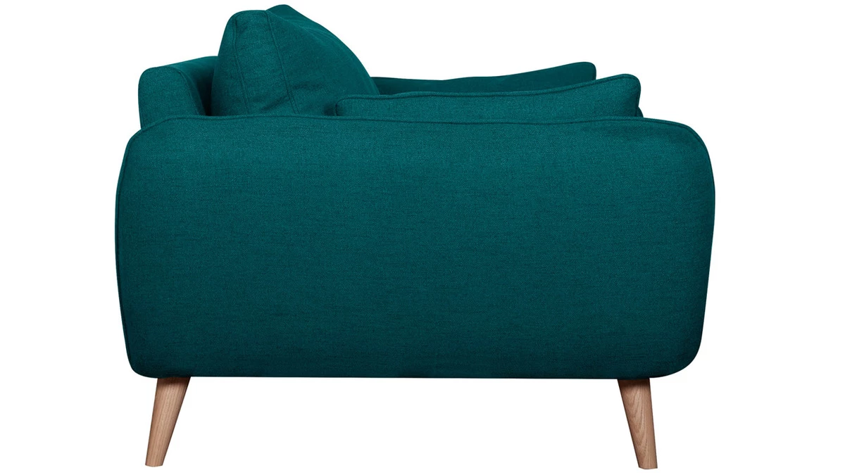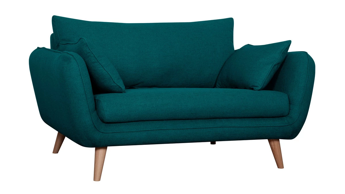 Avec son design tout en courbes et ses proportions généreuses, ce canapé scandinave nous offre un confort durable. Son assise moelleuse (L107 x P60 cm) est une invitation à la relaxation tandis que son joli revêtement bleu paon (100% polyester) nous enveloppe de douceur. Il est complété par un piètement compas en hêtre massif à la fois naturel et un brin rétro.