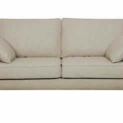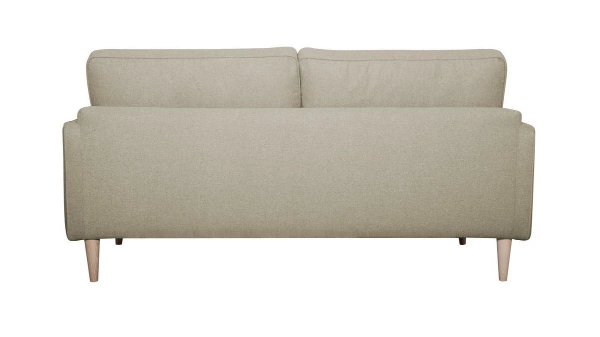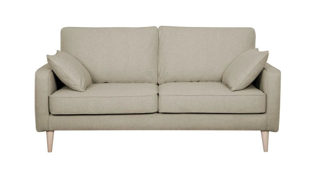 Ce canapé familial dévoile un sens du détail tout français. Il est habillé d’un élégant tissu beige 100% polyester avec des finitions soignées (surpiqûres) qui se marient à merveille aux quatre pieds en pin massif.