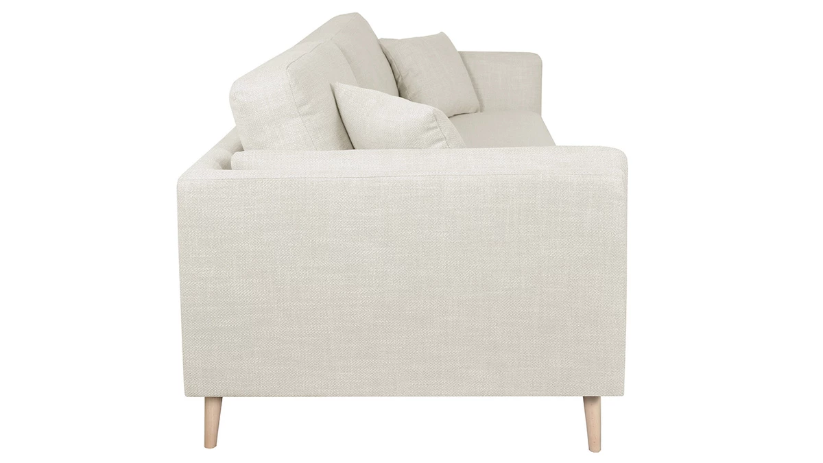 Le canapé scandinave VOGUE est une assise 3 places confortable. D’épais coussins d’assise garnis de mousse haute résilience (densité 30 kg/m3) accompagnés de petits coussins d’appoint pratiques garantissent un confort d’assise agréable. Grâce à sa structure en pin et ses pieds en hêtre massifs, le modèle VOGUE est un allié solide pour aménager un espace convivial dans le salon.