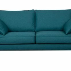 Ce canapé familial dévoile un sens du détail tout français. Il est habillé d’un élégant tissu bleu canard 100% polyester avec des finitions soignées (surpiqûres) qui se marient à merveille aux quatre pieds en pin massif.