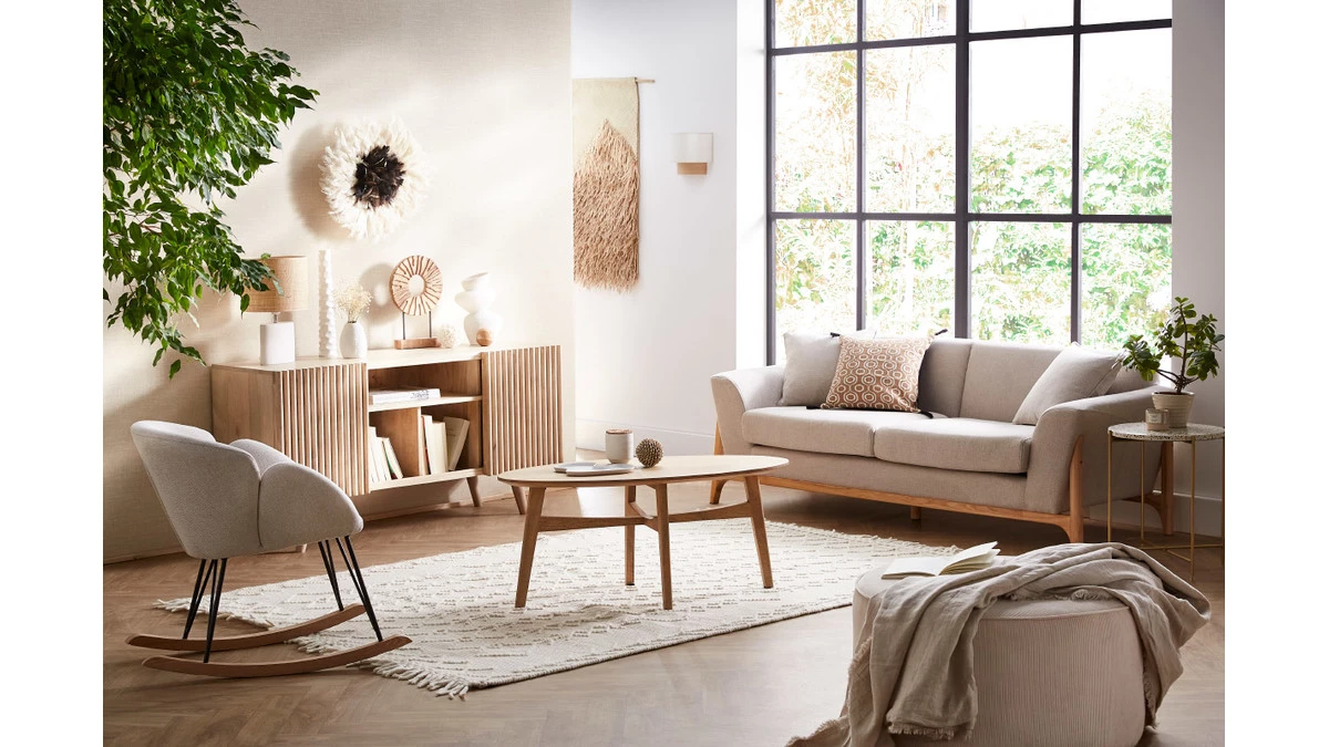 Ce canapé à l’apparence minimaliste trouve sa place partout. Composez une ambiance ultra cosy dans le séjour en l’accompagnant d’une jolie table basse en bois de la collection Miliboo.