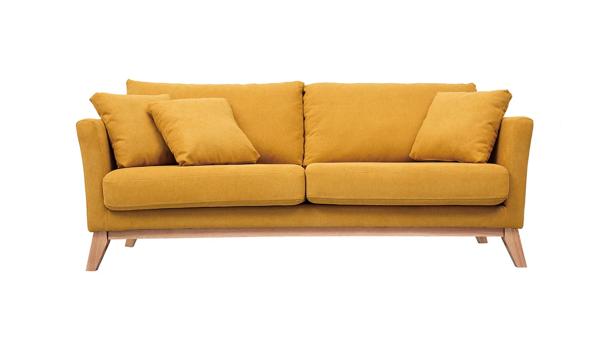 Le canapé scandinave 3 places OSLO : un look d’inspiration nordique et un revêtement en tissu effet velours moutarde pour un salon déco et indémodable !