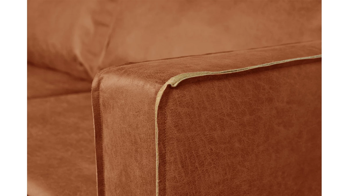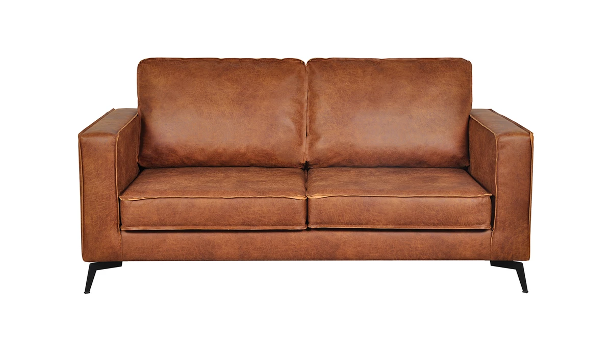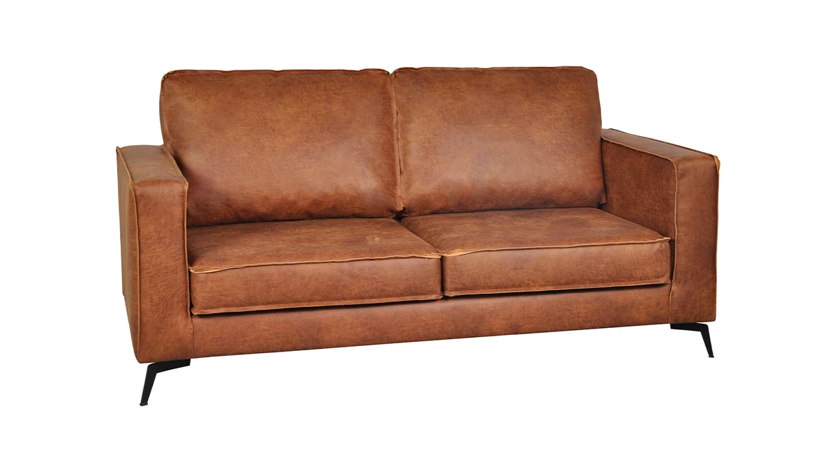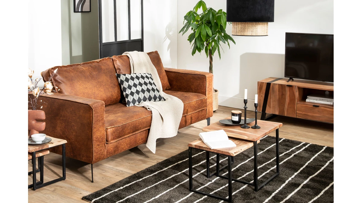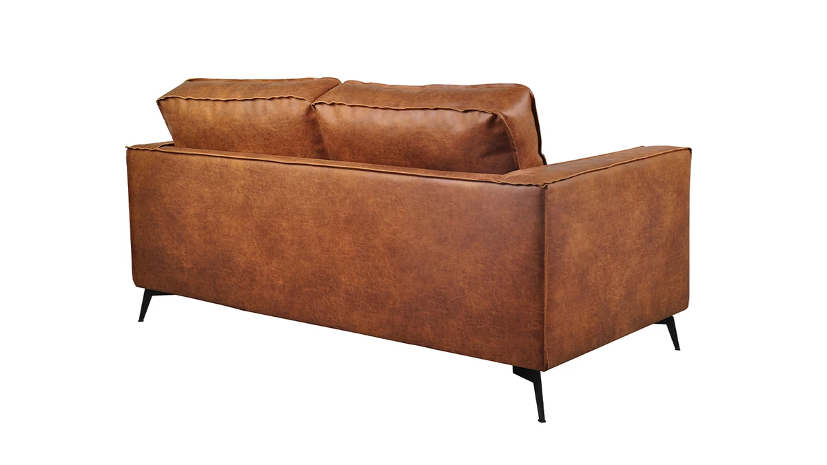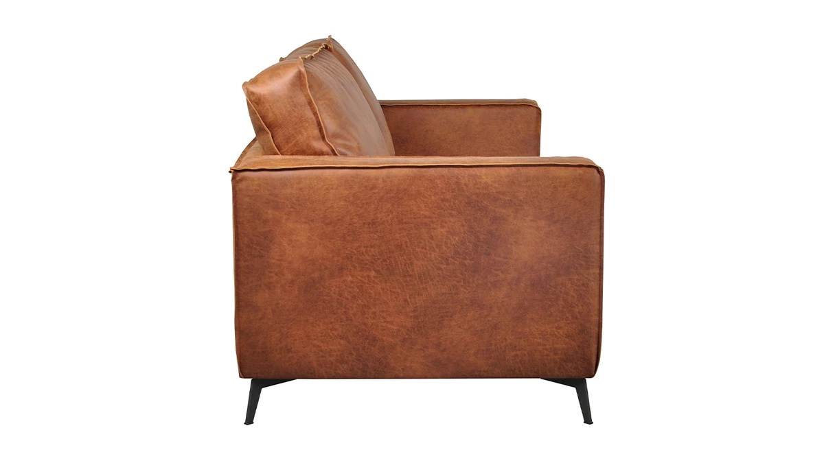 Tout le charme du canapé SONNY réside dans son revêtement en cuir de vache reconstitué à l’aspect vieilli, faussement usé. Donnant cette impression d’avoir été patiné par le temps, ce canapé marron cognac est une belle pièce de caractère qui fera toute la différence dans votre salon. Pour parfaire son look authentique, ce canapé vintage repose sur des pieds en métal noir.