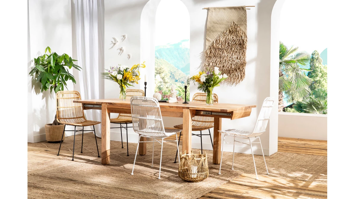 Pour une atmosphère conviviale et chaleureuse, disposez ces chaises en rotin design autour d’une table en bois.