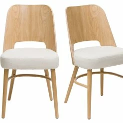 On adore le look cosy de ces chaises légères et robustes. Avec leur design tout en courbes, elles sont le résultat d’un joli travail sur la matière. Le dossier en contreplaqué courbé forme une enveloppe protectrice tandis que l’assise rembourrée (densité de la mousse 35 Kg/m3) garantit un confort durable au quotidien. L’assise est habillée d’un joli revêtement en tissu effet laine bouclée écru qui se marie à merveille avec le bois clair.