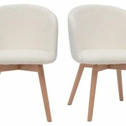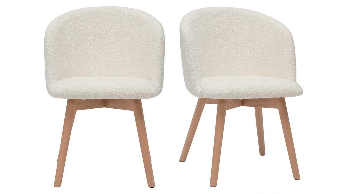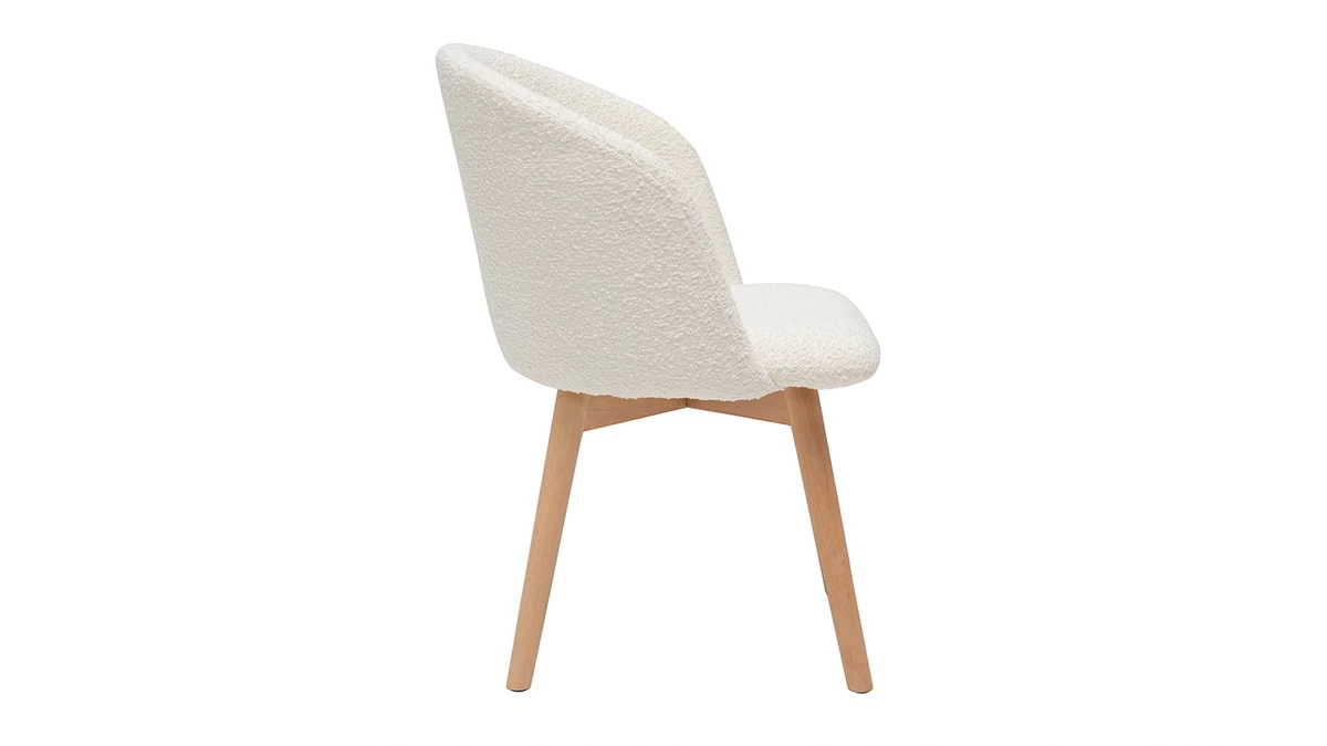 Avec leurs formes généreuses et leurs pieds en bois blond (hêtre massif), les chaises VANITY font écho à la tendance Hygge qui célèbre un art de vivre chaleureux et authentique. Leur revêtement effet laine bouclée nous transporte dans un monde de douceur. Leur dossier enveloppant (L56 x H39 cm) forme comme un rempart et leur assise moelleuse (densité de la mousse 25 kg/m3) est propice à de longues soirées de détente autour d’un bon repas.
