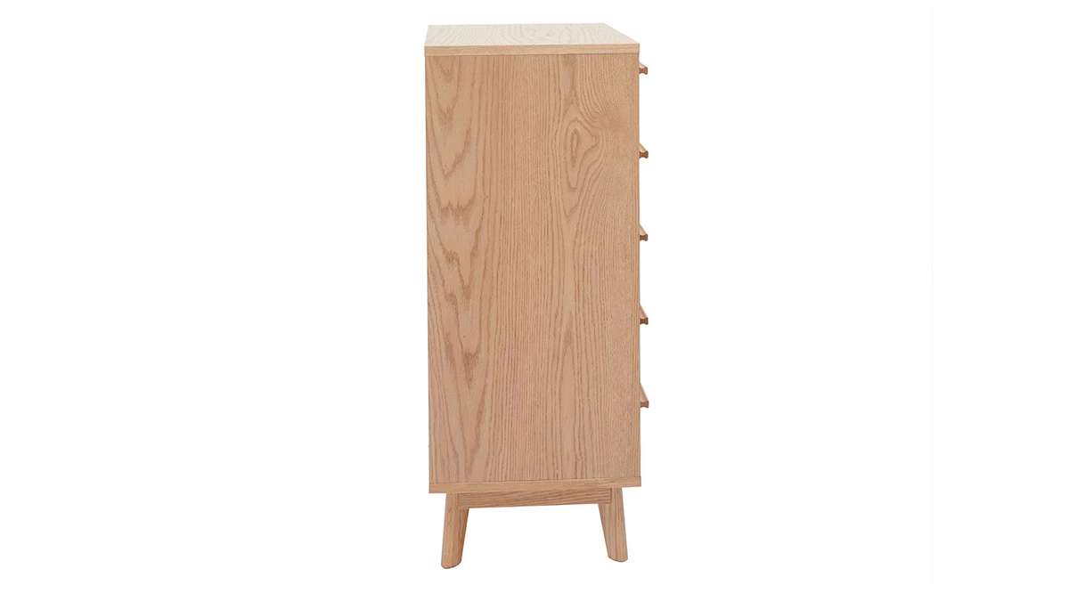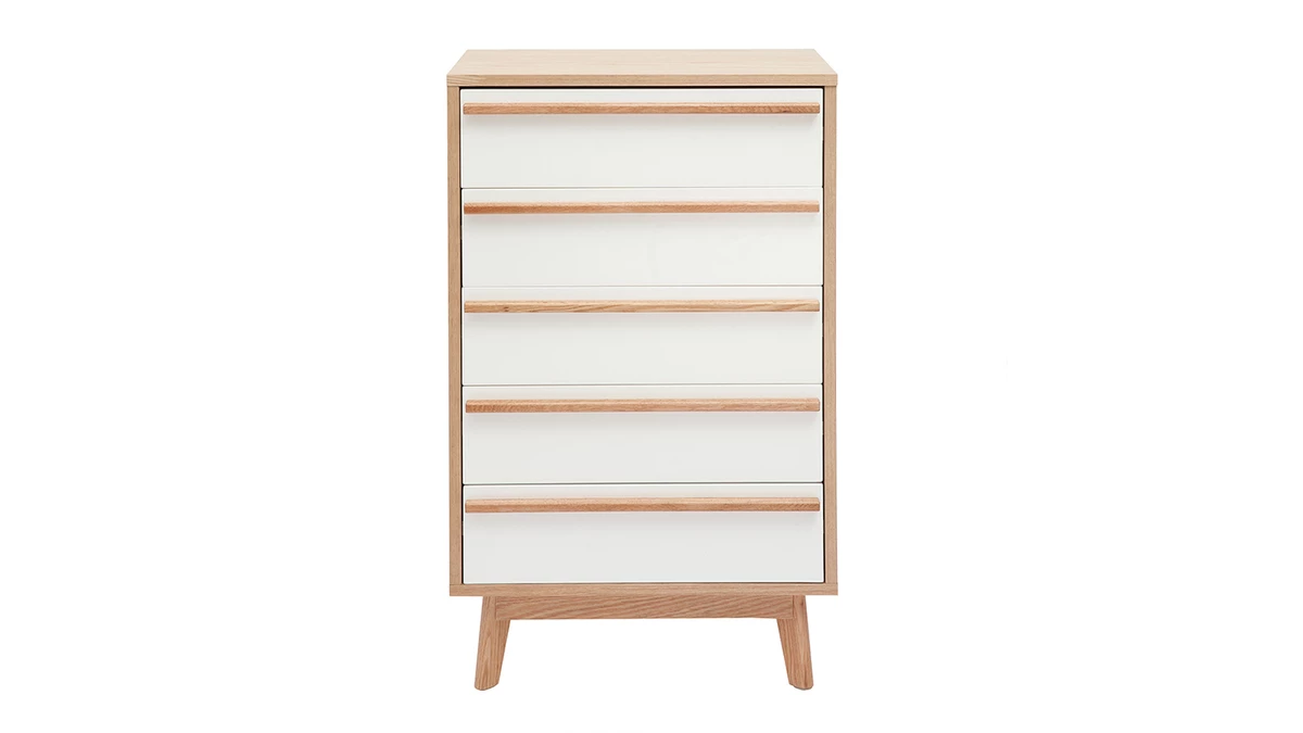 Fabriquée à partir de panneaux de fibres de bois placage chêne et finition blanc mat, cette commode à tiroirs compte pas moins de cinq spacieux rangement tiroirs (L50.5 x P30.5 x H10 cm). Un ensemble supporté par un piètement en chêne massif, gage de stabilité et robustesse.