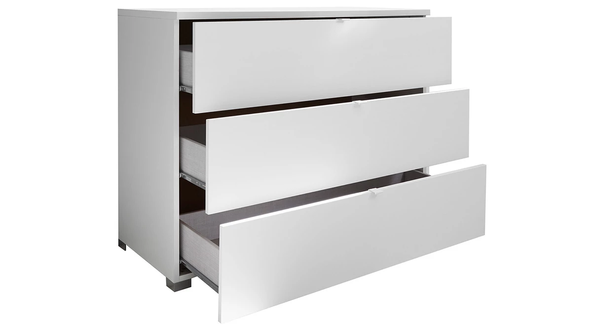 Avec ses dimensions compactes L104 x P45.3 x H80 cm et son design épuré : cette petite commode blanche reprend les codes de l’esthétique minimaliste dans une version gain de place ultra fonctionnelle. Equipée de trois grands tiroirs, ce meuble de rangement permet d’organiser les affaires de la chambre sans l’encombrer. Des poignées métalliques facilitent l’ouverture et la fermeture de chaque espace de rangement (L100 x P41.5 x H24.6 cm). Pratique et discrète, cette commode moderne s’adapte à tous les coins nuit.