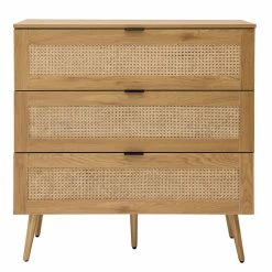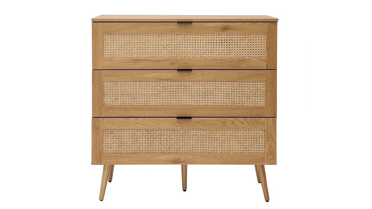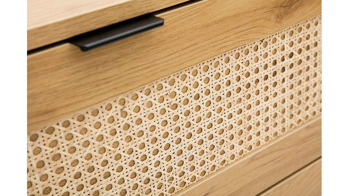 Résistante structure en panneaux de fibres de bois mélaminé finition chêne, tiroirs décorés en façade par la douceur du cannage, élégantes poignées en métal noir et piètement évasé en chêne massif unissent leurs atouts charme pour former une commode en bois clair et rotin ultra tendance ! Avec son design chaleureux, son look aérien et ses volumes maîtrisés, cette commode à l’inspiration vintage trouvera sa place dans des ambiances rétro ou bohème. Parfait pour jouer la carte du naturel et de l’authentique !