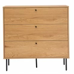 Avec ses lignes sobres et épurées, cette commode en bois aux dimensions L100 x P40 x H100 cm se plie à tous les styles de déco. La finition chêne (panneaux de fibre de bois mélaminé) se caractérise par de jolies nuances dorées ainsi que des noeuds et veines marqués. On aime le contraste entre le côté chaleureux et authentique du bois et le travail fin du métal. Le piètement métallique haut de 20 centimètres en métal noir permet de libérer de la place au sol et d’élever le meuble pour plus d’esthétisme.