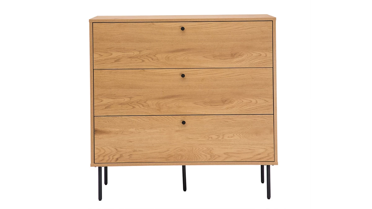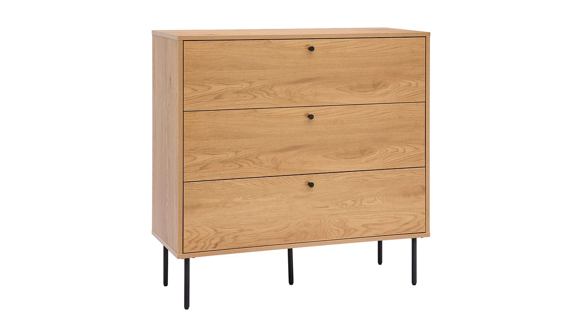 Cette commode à tiroirs – à la fois compacte et équipée de larges rangement – est l’alliée des petites chambres en quête de modernité. Elle pourra également habiller une entrée ou un couloir tout en longueur. Ses trois tiroirs (dimensions intérieures L92 x P33.5 x H18 cm) sont assez grands pour accueillir vos vêtements, votre linge de maison, des accessoires de mode ou des documents en fonction de son utilité.