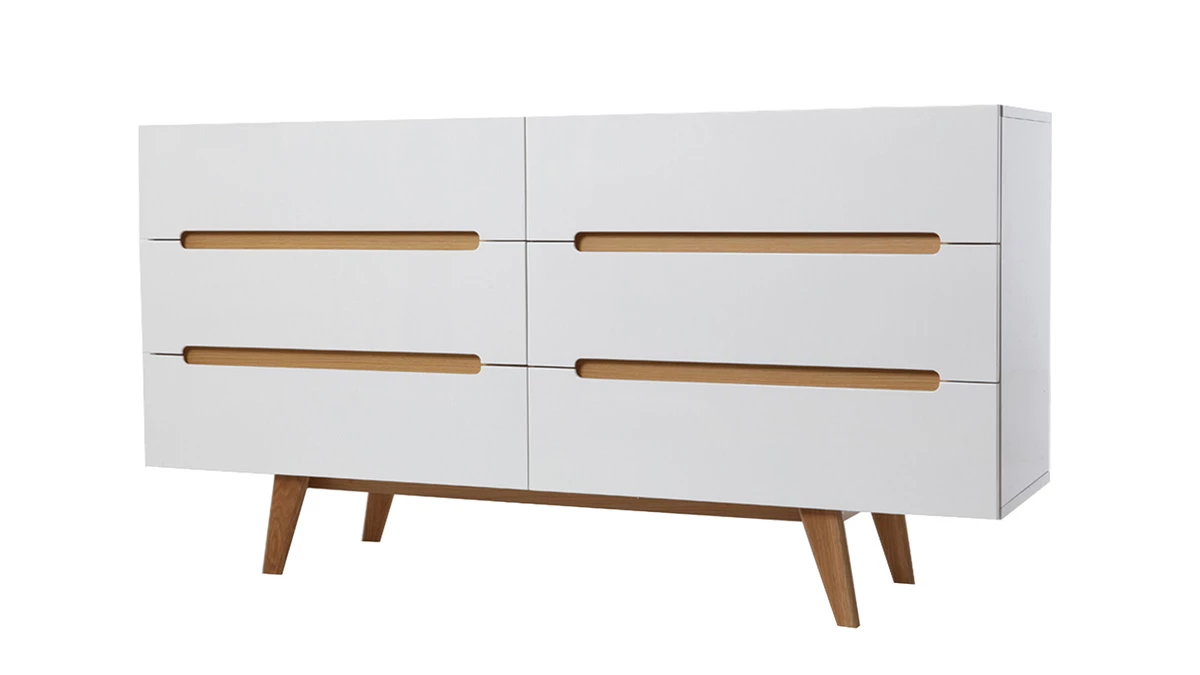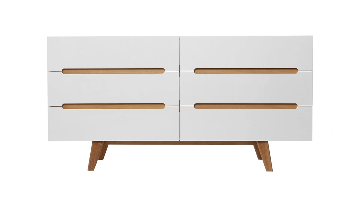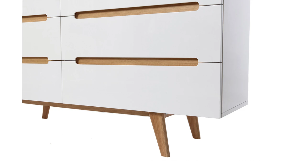 Conçue en panneaux de fibres de bois, cette commode blanche aux détails en bois clair se veut résolument robuste. Elle pourra vous accompagner sur une longue période. Dotée de finitions parfaites, cette commode blanc brillant dispose d’un pietement bois en frêne massif et de découpes également en frêne en guise de poignées. Sans aucun doute vous succomberez au charme de celle ci.