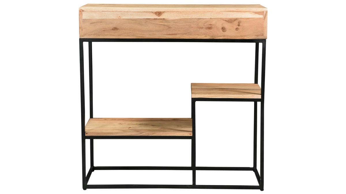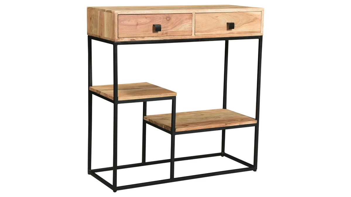 Composée d’une structure en métal et de différents plateaux en acacia, cette console en bois et métal noir munie de 2 tiroirs et 2 plateaux étagères vous accompagne autant dans une entrée que dans un pièce de vie. Idéale pour se concocter un coin déco tout en organisant l’espace, cette console avec rangements offre des espaces fermés et ouverts pour garder à portée de mains les objets du quotidien !