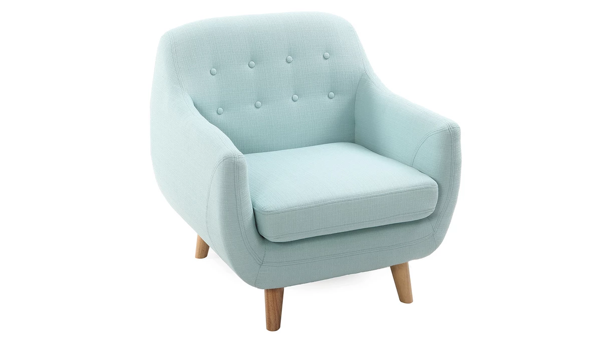 Formes arrondies et aériennes, revêtement en tissu, dossier capitonné, piètement en bois clair, ce fauteuil bénéficie d’un ensemble de caractéristiques qui s’harmonisent parfaitement bien.