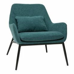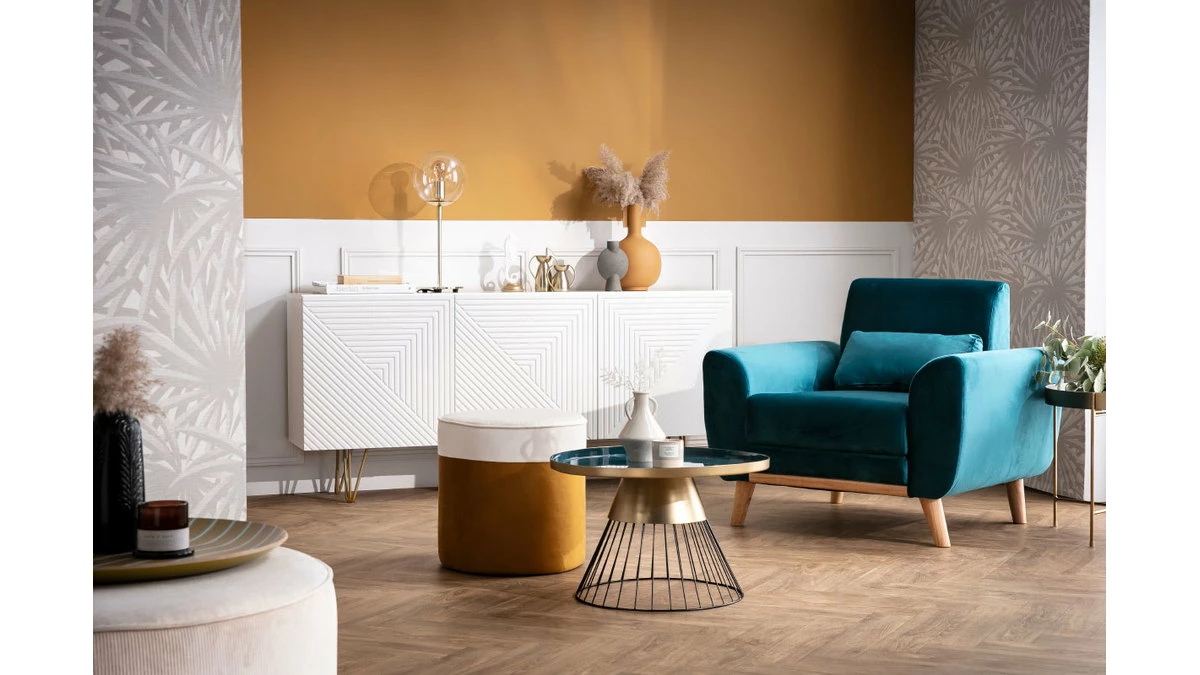 Pour un salon sophistiqué, on accompagne ce fauteuil bleu pétrole d’une table d’appoint tendance, en laiton ou marbre.