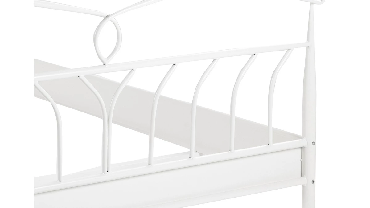 Magnifique pièce au design épuré, ce lit 2 places est idéal pour un espace nuit moderne et romantique. Sa structure en métal donne à l’ensemble un style aérien et délicat. On aime l’association d’une ligne légère avec un blanc lumineux. Son joli look monochrome se marie à de nombreux styles déco. Avec ce lit blanc, on s’aménage la chambre de ses rêves ! Pour un espace nuit zen et naturel, on l’accompagne d’une table de chevet en bois. Pour un esprit contemporain, on opte pour des jolis meubles de rangement minimalistes.