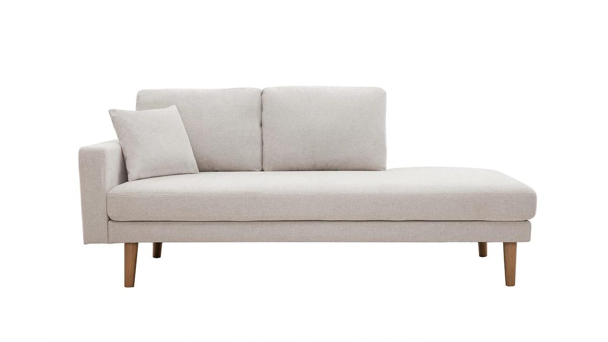 Cette méridienne aux lignes épurées est habillée d’un tissu beige doux et lumineux qui s’accorde à merveille aux pieds fuselés en hévéa (hauteur des pieds 20 cm). Elle est aussi livrée avec un petit coussin supplémentaire (L35 x L35 cm) à placer librement.