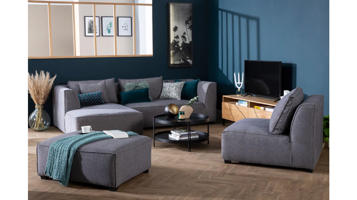 Ce module d’angle en tissu se pare d’un beau tissu gris anthracite. Avec son look intemporel, on imagine parfaitement ses volumes douillets et lignes épurées dans une pièce de vie à la déco contemporaine.