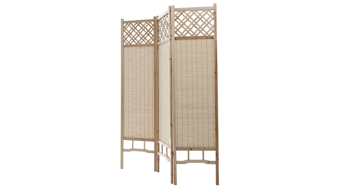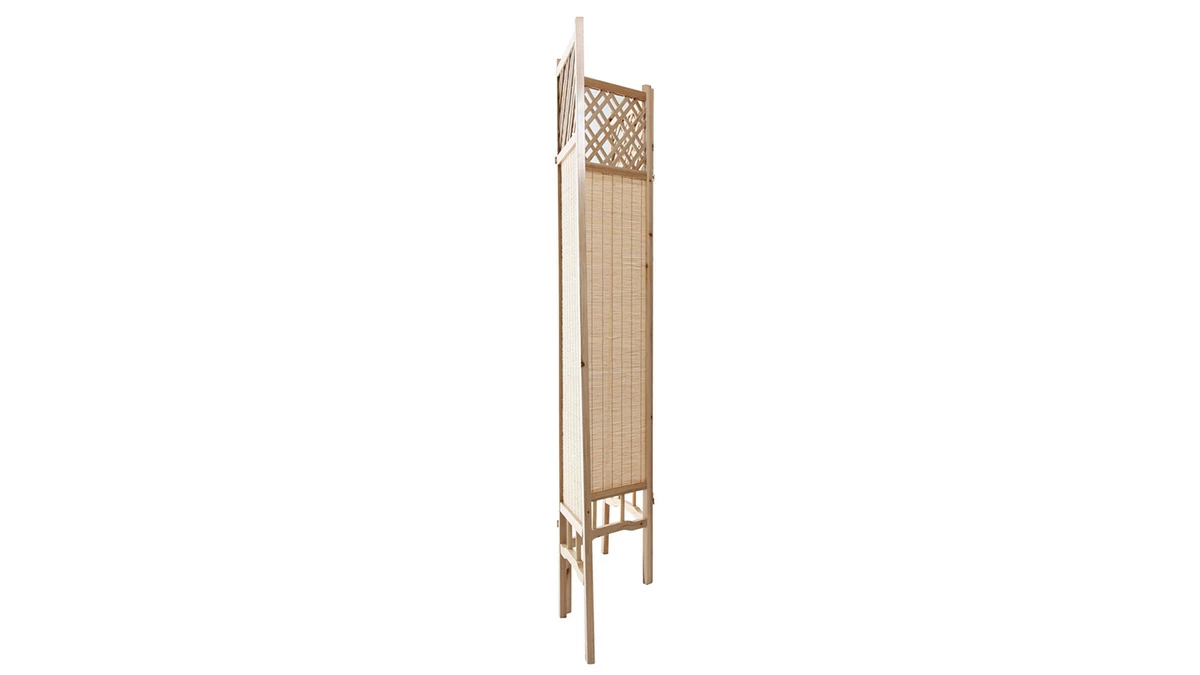 La structure de ce paravent est en bois de sapin, finitions bois naturel et l’intérieur des panneaux est en lattes de bambou.