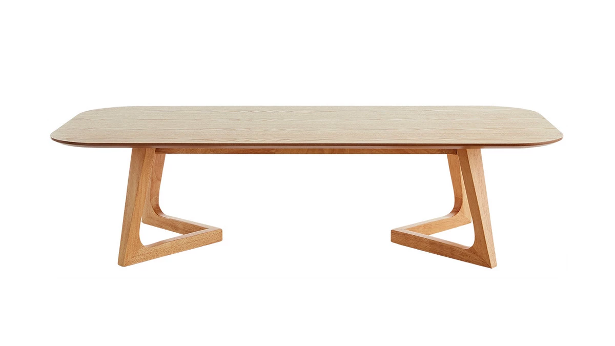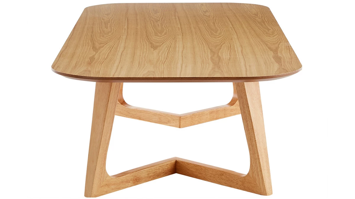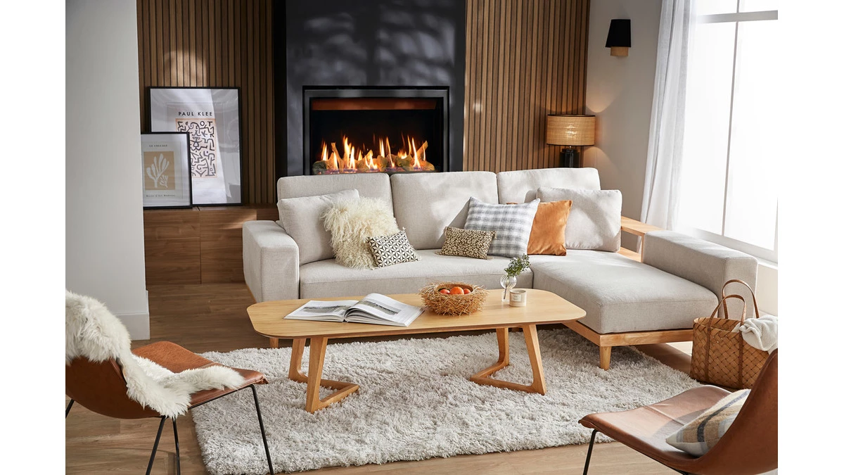 Pour un intérieur aussi cosy que trendy, on accompagne cette grande table basse en bois d’un canapé épuré, d’un pouf effet laine bouclée, et d’un fauteuil design branché !