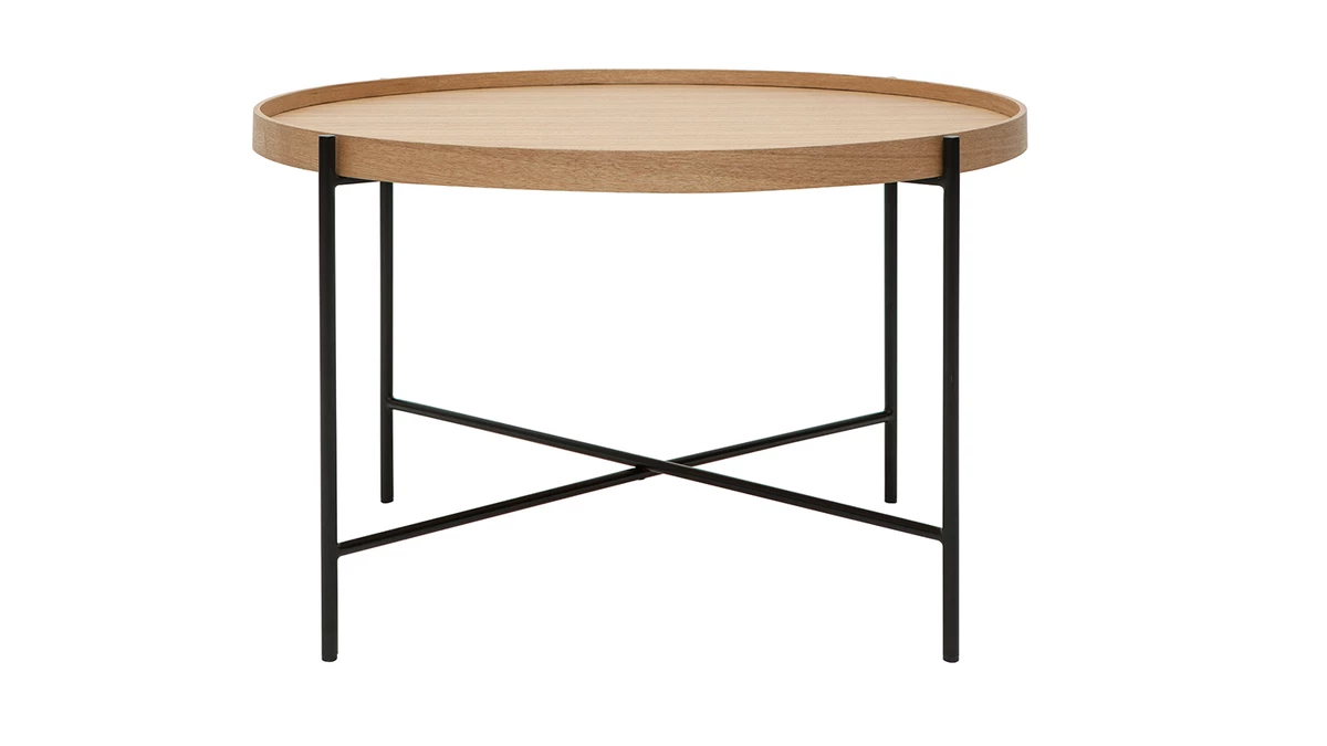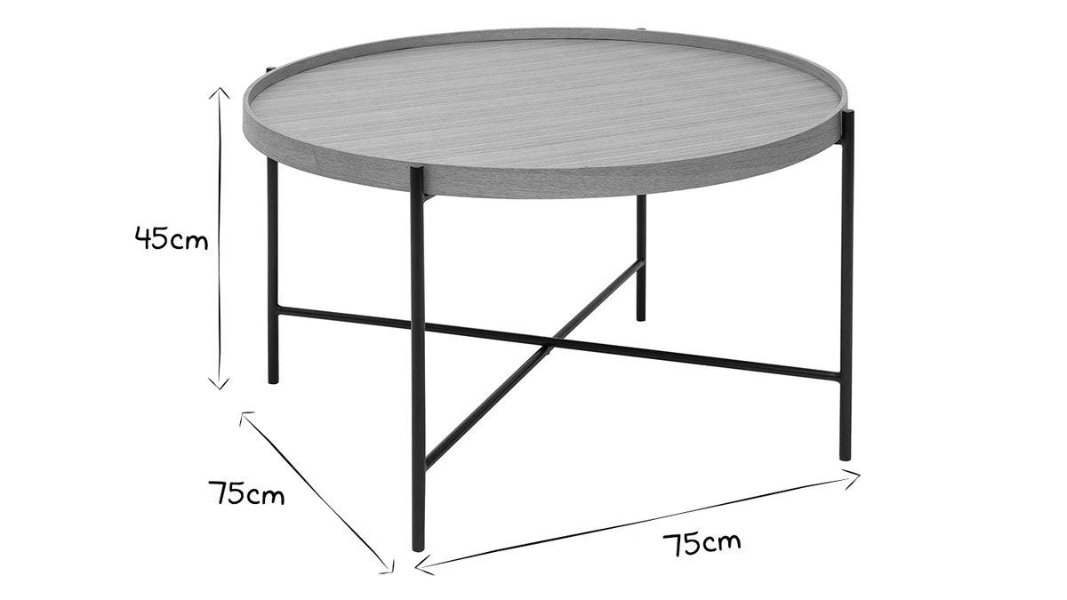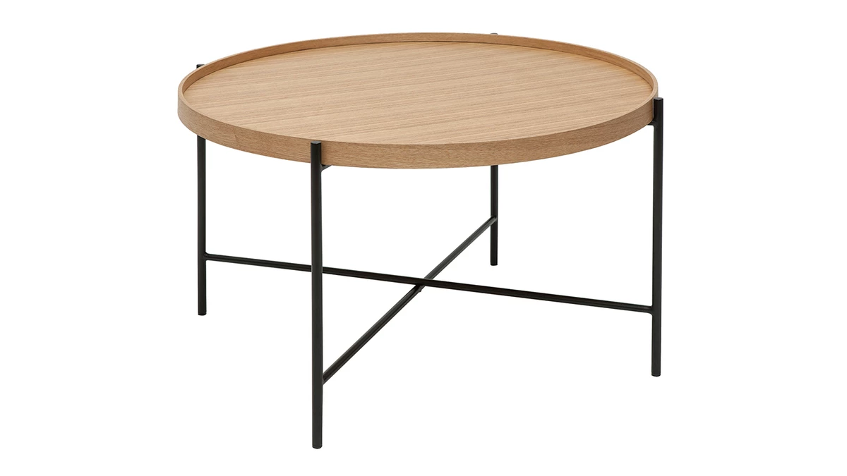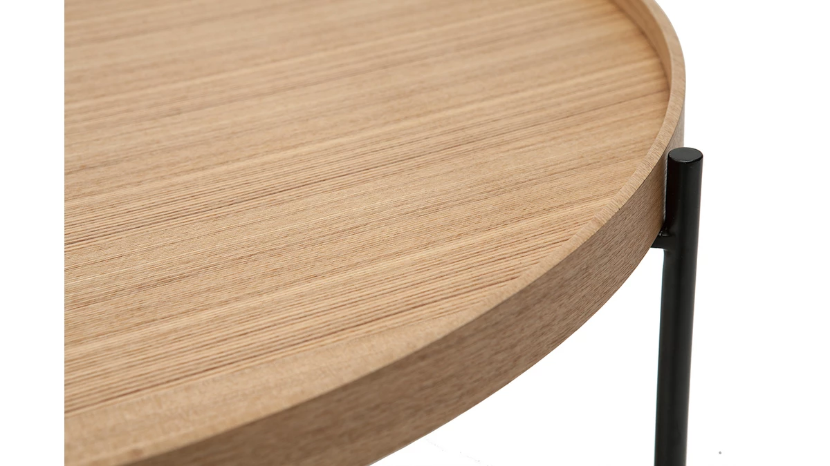 La table basse BASSY combine harmonieusement le bois et le métal. Les matières sont travaillées tout en finesse, les proportions sont parfaitement étudiées. Le grand plateau (D75 cm) en contreplaqué frêne est soutenu par une fine structure en métal noir. La délicatesse de la structure n’empêche pas la stabilité de l’ensemble. Le rebord du plateau (1.5 cm) participe à l’esthétique tout en permettant d’éviter les chutes d’objets. On aime la chaleur du bois et ses jolies veinures qui apportent beaucoup de caractère.