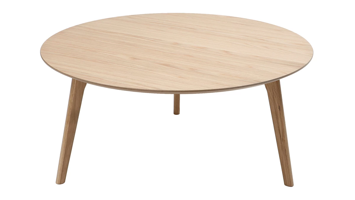 Son plateau de 90cm de diamètre est en panneaux de fibres de bois plaqué chêne. Ses pieds sont en chêne massif.