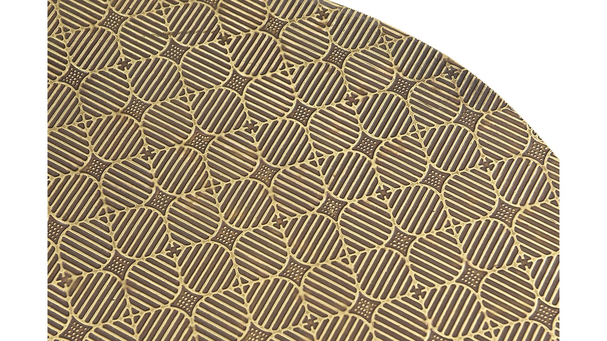 Cette petite table ronde affiche un look original et raffiné. Son plateau en panneaux de fibres de bois est recouvert d’une couche de laiton frappé. Ce matériau, apprécié pour son aspect doré brut, a été travaillé artisanalement. Le motif géométrique dessiné dessus offre un rendu graphique unique. Ce plateau rond décoratif est associé à un piètement en métal fin faisant de la table basse FLOOR une pièce de mobilier pleine de charme.