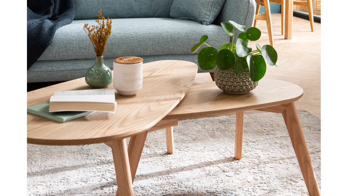 Jouez avec sa forme ovale pour créer une jolie composition. Ces tables gigognes peuvent aussi très bien vivre séparément comme chevets dans la chambre, supports pour plantes dans l’entrée ou encore tables d’appoint en bout de canapé. Les différentes hauteurs des plateaux permettent de gagner de précieux mètres carrés.