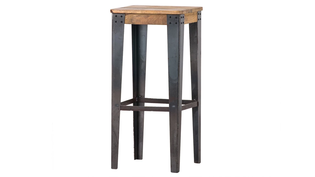 Les angles, renforcés par des cornières rivetées, soutiennent un tabouret en bois de manguier. Le manguier est naturellement teinté dans les tons jaunes à marron et c’est un bois très résistant qui saura durer dans le temps sans vieillir.