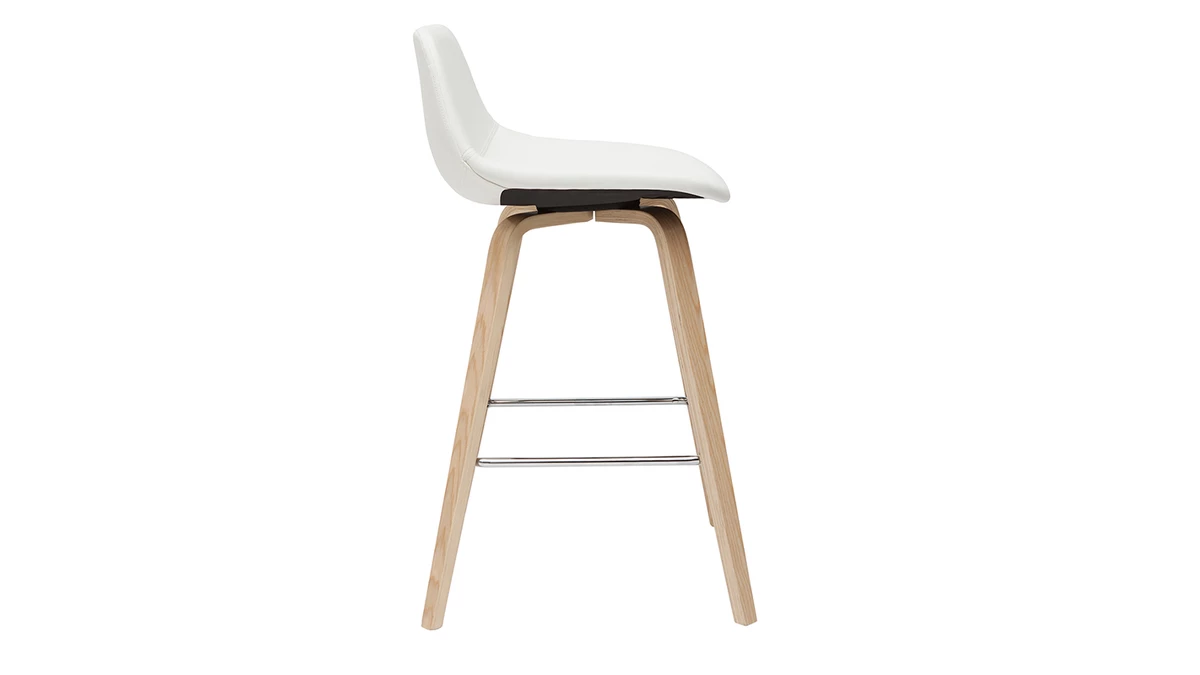 L’assise et le dossier haut sont rembourrés (densité de la mousse 24 kg/m3) et recouverts d’un joli revêtement en polyuréthane blanc. Les pieds inclinés bois clair et le repose-pied de hauteur standard participent également au confort.