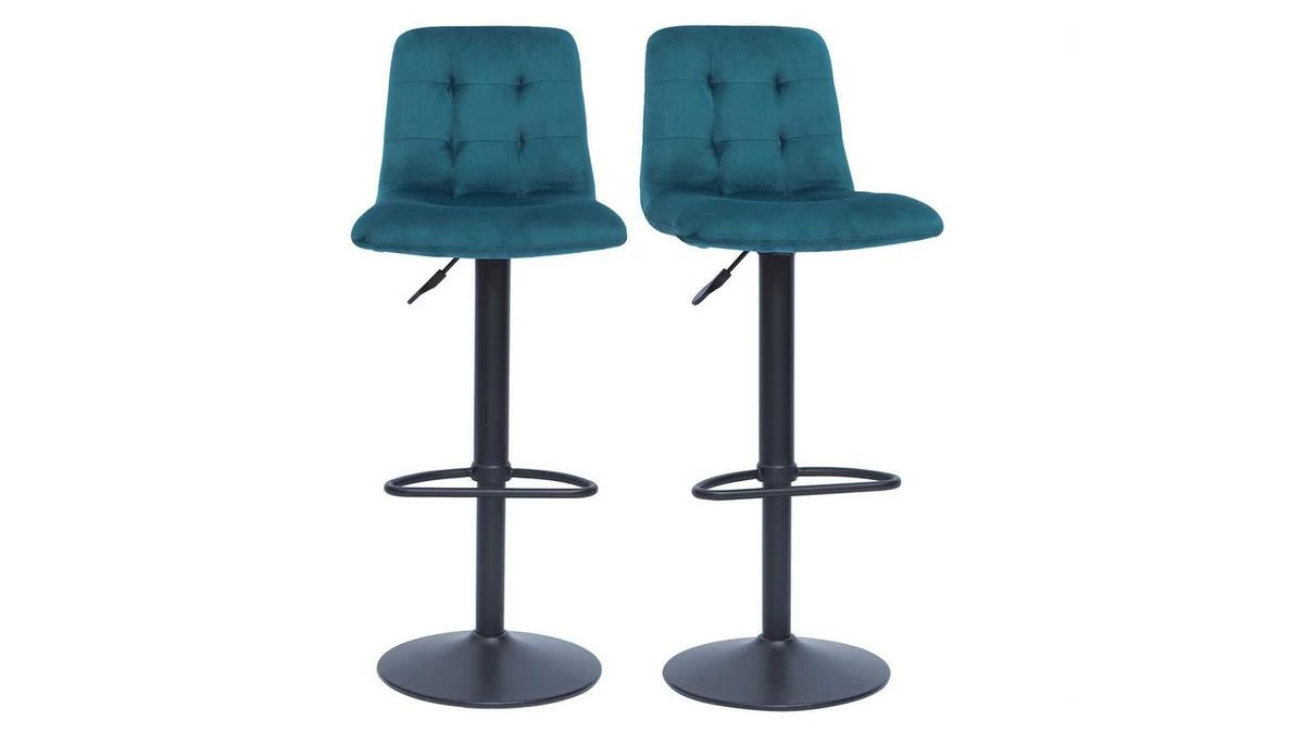 Ces tabourets de bar à l’allure légère et moderne associent un joli tissu velours gaufré bleu pétrole (100% polyester) à un piètement en métal noir réglable en hauteur. Avec leur élégant capitonnage, ces tabourets de bar s’intègrent facilement dans tous les intérieurs.