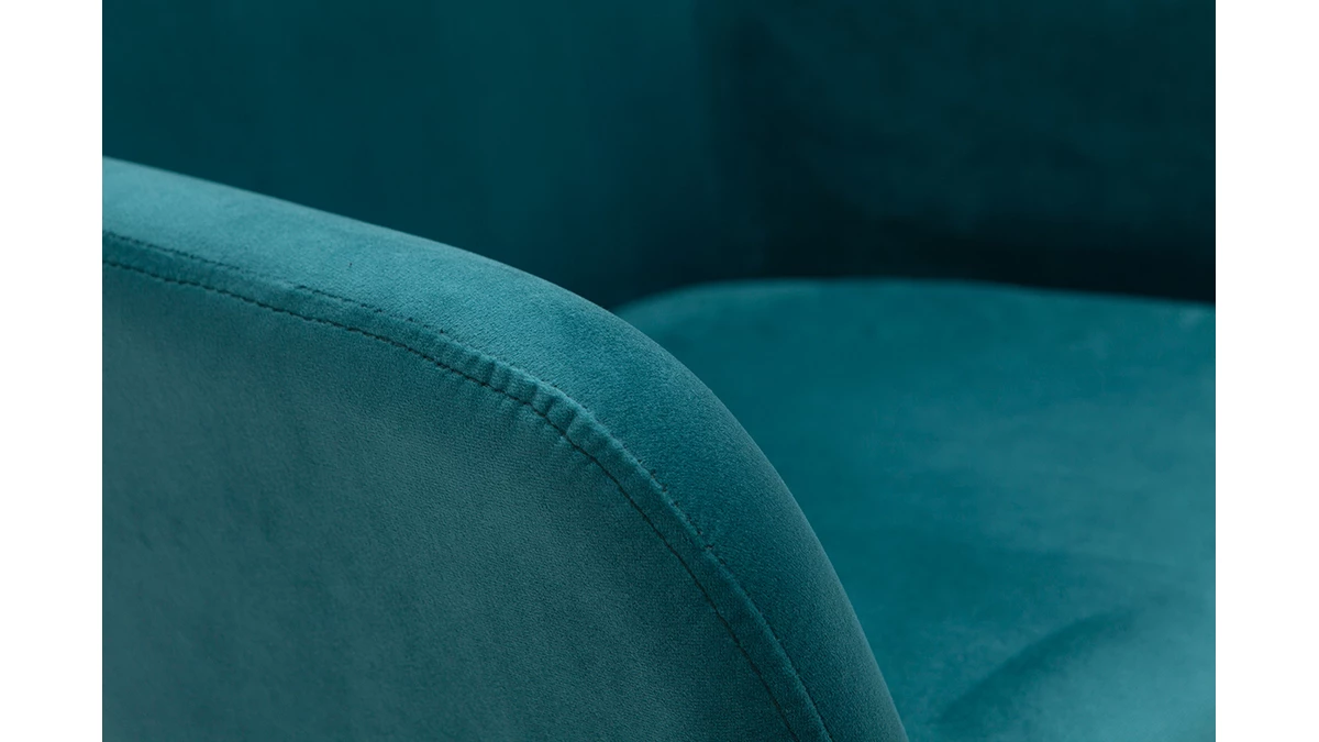 On aime particulièrement le contraste entre le piètement luge en métal noir très élancé et l’enveloppante assise rembourrée et moelleuse à souhait. L’assise et le dossier sont entièrement recouverts d’un joli velours 100 % polyester à l’aspect et au toucher doux. La teinte bleu pétrole ajoute à l’ensemble une touche tendance élégante.