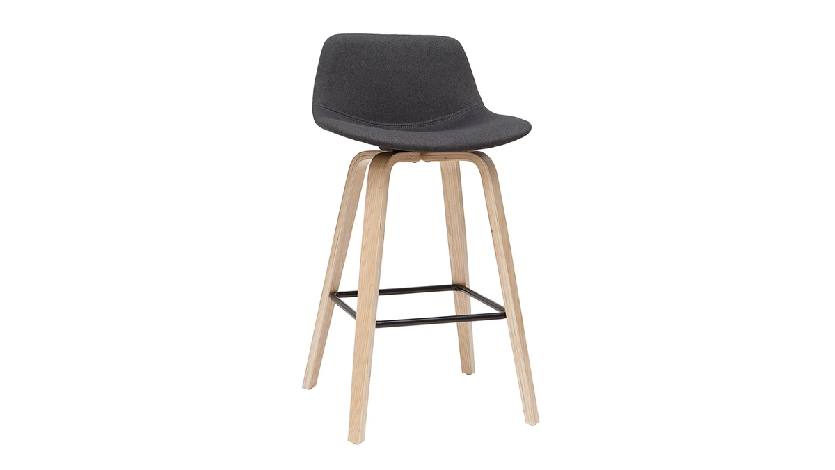 L’assise et le dossier haut de 24 centimètres sont rembourrés (densité de la mousse 24 kg/m3) et recouverts d’un joli tissu gris foncé doux et très souple en polyester. Les jolis pieds inclinés en bois clair (contreplaqué de peuplier) et le repose-pieds de hauteur standard participent également au confort.