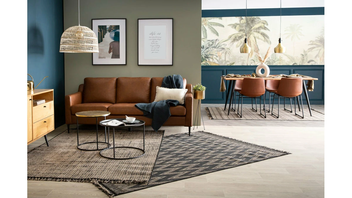 Pour un salon chaleureux et tendance, on habille le sol d’un tapis graphique ETNICA !